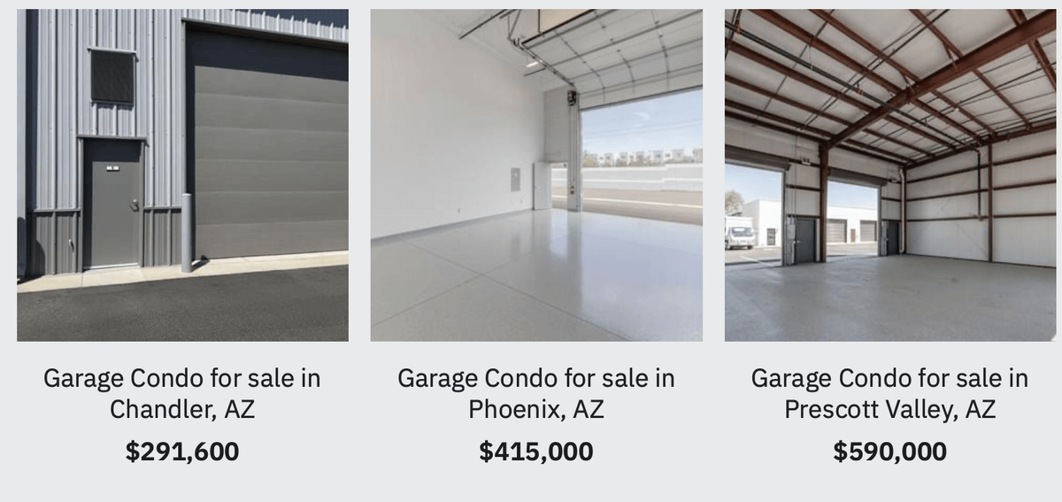 Most garage condos in Arizona have seen a significant increase in price in the last 2-3 years. Falcon Storage in Chandler, AZ had 8 garage condo sales in 2024 ranging from $245,000 to $410,000 per unit. Red Hawk Garage Suites in Phoenix, AZ had 4 garage condo sales in 2024 ranging from $314,900 to $420,000 per unit. The Toy Barn in Arizona had 20+ sales in 2024 ranging from $65,000 to $920,000.