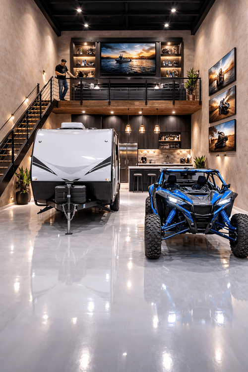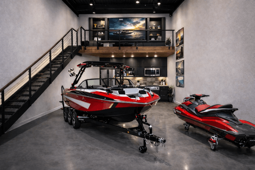 Use it as a private showroom. A river-weekend refresh station. A secure place for the boat. A climate-controlled home for cars, side-by-sides, tools, gear, and collectibles. Or personalize it into something entirely your own: lounge, office, card room, showroom, or mezzanine-level escape.