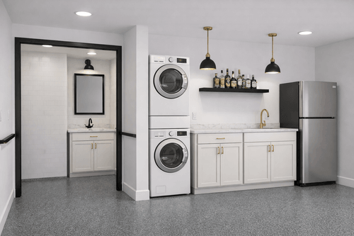 Every unit includes a well-appointed standard feature package with climate control, kitchenette, full bathroom including shower, washer/dryer, RV-amp electrical outlet, 24/7 secure access, roll-up garage doors, and high-speed secure fiber-optic pre-wiring. Building B pull-through units include mezzanines by default, while Buildings A and C are mezzanine-ready.