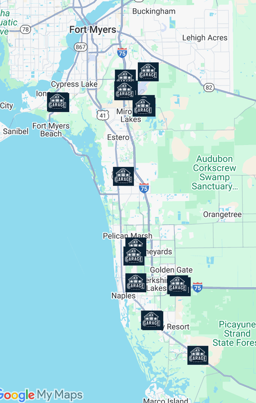 Units vary widely: smaller (~700-1,200 sq ft) to large (~2,000-4,400 sq ft) units. High clear ceiling, large roll-up doors, double-deep (for boats / RVs) units. Smaller/basic units often $250,000-$400,000; mid-sized with good finishes often $400,000-$800,000+; premium large garages, prime locations (Naples etc.) go well north of $1M.