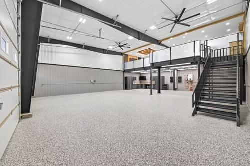 This upgraded 40’x50’ garage condo delivers a turnkey, design-forward space for collectors and hobbyists, featuring a fully finished mezzanine, sleek black and grey epoxy floors, modern glass railing, and oversized fans for comfort and visibility year-round. Located in a secure, gated community with 24/7 access, it offers the ideal blend of style and function for vehicle storage, workshop use, or a personal retreat in a highly desirable setting.